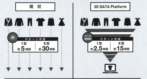 パターンデータを読み込み3Dモデリングし、データを蓄積して実績を増やすことで作業を大幅に短縮し、アパレルの生産工程の効率アップに取り組んでいます。また、企画、サンプルチェック、フィッティングをバーチャルで確認し、早い段階から店頭及びEC販売まで検討できます。