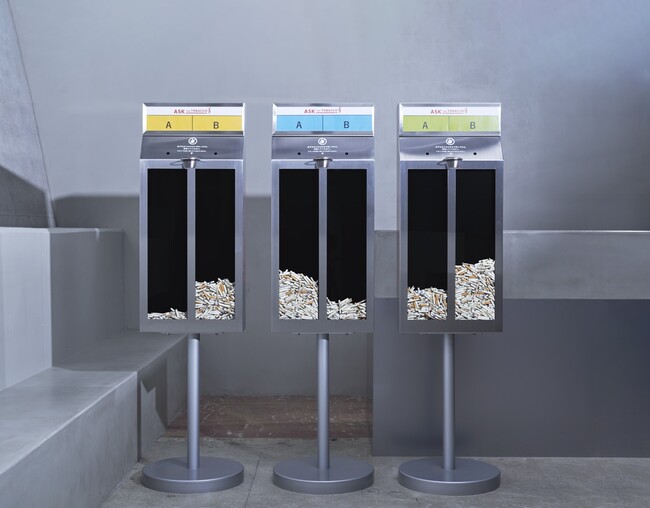 当社の投票型喫煙所は、灰皿に「人生に大事なのは金か、愛か」など、誰しもが悩む究極の2択の設問を記載し、吸い殻を自身が選んで捨てることができる「投票型灰皿」を設置した喫煙所です。楽しみながらたばこのポイ捨てを減らすことを目的とし、行動経済学(ナッジ)に基づいた喫煙者が能動的に吸い殻を捨てたくなる仕組みが特長です。
