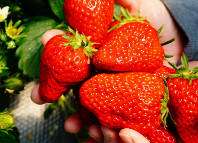 一般的ないちごの糖度は10~15程度と言われておりますが、成田ファームランドでは独自の農法により、どの品種でも糖度20を目指すことができます。甘さの強くなった当店の苺は香りが強く、農場の道路向いまで匂いがするほどです。そして、そんな苺を丸ごと削るからこそ、当店の「丸ごといちご削り氷」は、いちごの氷でも香りや甘さがしっかりと感じられ、他では味わうことのできないかき氷になっています。