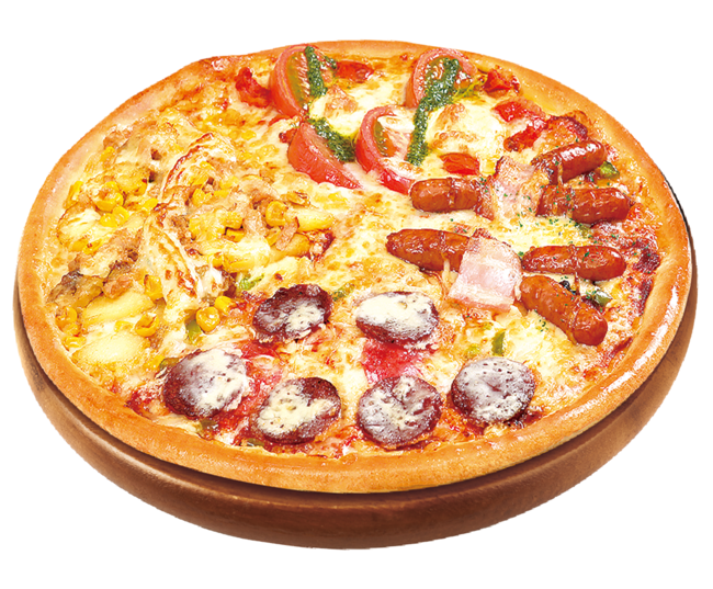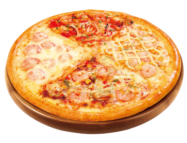 4種の海鮮を贅沢に使用した”香味海鮮シーフードデラックス”とエビたっぷり定番”エビマヨネーズ”、とろ~り食感が楽しい”エビフォンデュ”、彩り豊かな”特選エビホタテ”の4種のシーフードピザが1つに。海鮮をこれでもかとトッピングした究極ピザです。