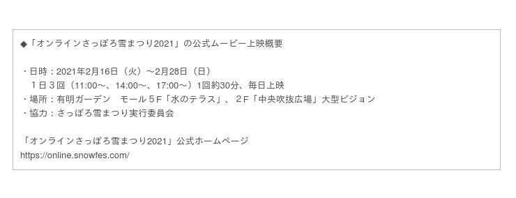 住友不動産商業マネジメント株式会社は、「さっぽろ雪まつり実行委員会」の協力により、運営する商業施設「住友不動産 ショッピングシティ 有明ガーデン」において、2/16(火)から2/28(日)まで「オンラインさっぽろ雪まつり2021」の公式ムービーを毎日上映いたします。