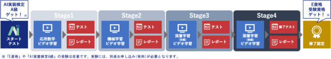 AI実装検定(R)A級に合格後も、ステージ1、ステージ2、最終テストと、それぞれの段階で目標にできるテストがあり、自分のペースで少しづつ進んでいくことが可能です。