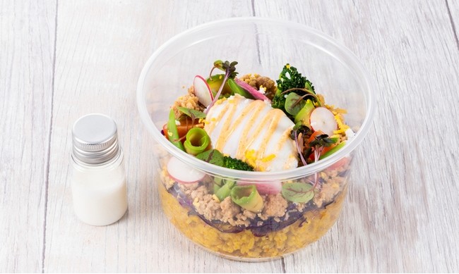ターメリックなどのスパイスと鶏の旨みを含んだカルローズの炊き込みご飯に、鶏そぼろや野菜を4層に重ね、見た目にも美しいカフェスタイルに仕上げた一品です。冷めても美味しいカルローズの特長が活きています。