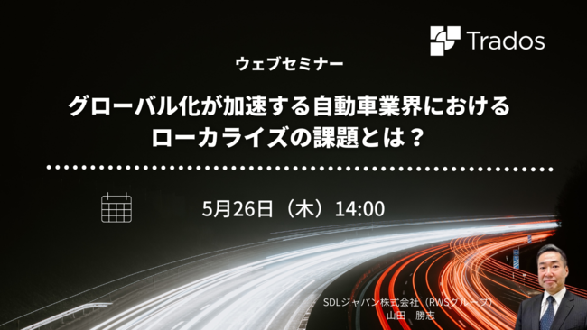 RWSグループ、SDLジャパン株式会社(本社:東京都目黒区、代表取締役:チャン・イン・リー、URL:https://www.rws.com/jp/)は、5月26日(木)に、45分間の無料ウェビナー『グローバル化が加速する自動車業界における、ローカライズの課題とは?』を開催いたします。