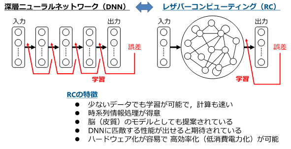 レザバーコンピューティングとは、ランダムな再帰結合を有するニューラルネットワークを利用するAI技術であり、その簡単な構造にもかかわらず、深層学習ネットワークに比肩し得る優れた性能が期待される技術です(下図参照)。