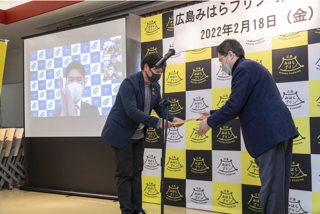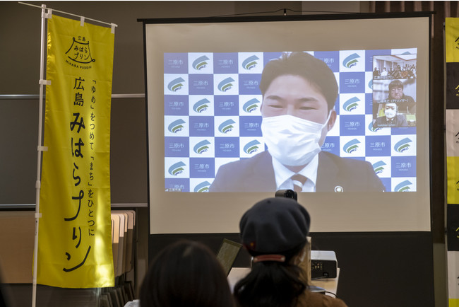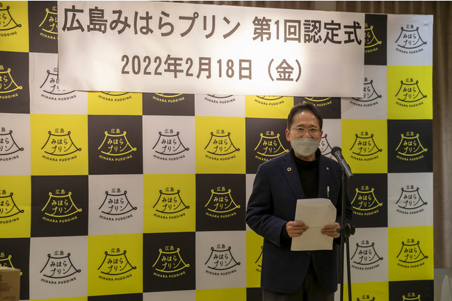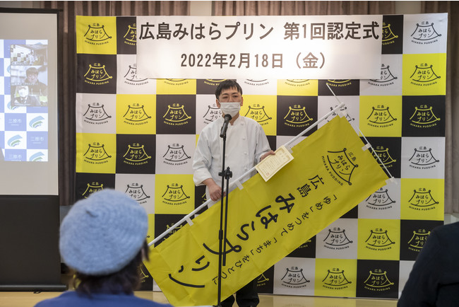 オンラインで参加された岡田吉弘三原市長から『本日広島みはらプリンの認定を受けた25品のプリンは、三原を代表する食材を使用し、店舗ごとに独自性、こだわりが、「ゆめ」となって詰め込まれた本当に素晴らしいプリン。「最近三原はプリンで熱い」と日常の会話で言っていただけるようになれば。まさに三原の魅力をオール三原で全国に発信していく本日は出発日となるので、本当に期待している』と、広島みはらプリンの完成度の高さと美味しさ、プリンに込められた三原への愛に対して、感動を伝えるとともに、期待をお話されました。