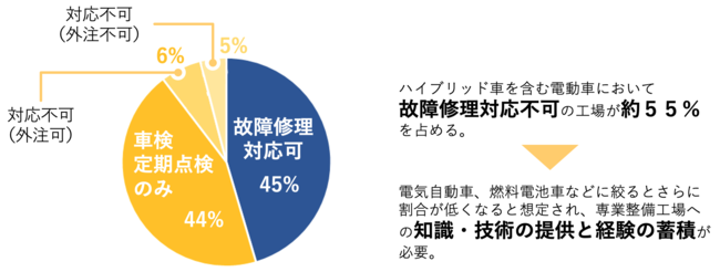 電動車の販売比率は今後さらに高まっていくと予想されますが、故障修理対応可の工場はハイブリッド車を含めても約45%にとどまりました。半分以上の工場が故障修理に対応していない結果です。電気自動車や燃料電池車に限定するとさらに割合は低くなると想定できます。