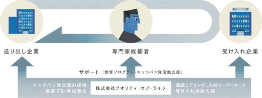 大企業での兼業・副業制度の導入や取り組みが進むなか、QOLでは、プロフェッショナルキャラバン隊に参加した、大企業、参加人材、中小企業の意向を踏まえたうえで、プロジェクト形式で大企業人材が提案プランのプロジェクトに参画し、推進できるよう、企業とミドル・シニア人材をマッチング、企業が抱える様々な経営課題を解決する『生涯プロフェッショナル/Engun』の一環として研修後のサポート事業の提供を開始。