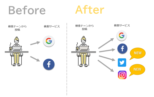この度投稿機能が大幅にアップデートされたことでGoogle、Facebookの投稿に加え、Instagram、Twitterにも一括で投稿が可能になりました。