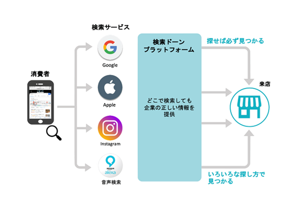 「検索ドーン」は、GoogleやFacebookを含む様々な検索エンジン、マップ、SNS、口コミサイトなどに店舗の魅力を一元発信、一元管理を行うことができるサービスです。