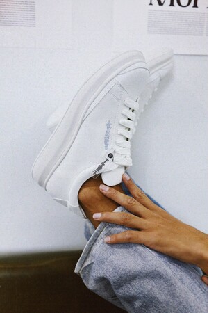 今回は、GO WITH WHITEの「POLAR」に、同時リリースとなった「”瞬き feat. TOMMY HONDA」のジャケットのアートワークからインスパイアされ、花をモチーフにしたデザインを刺繍を施し、どんなシーンでも気張らずに履けるデザインに仕上げています。