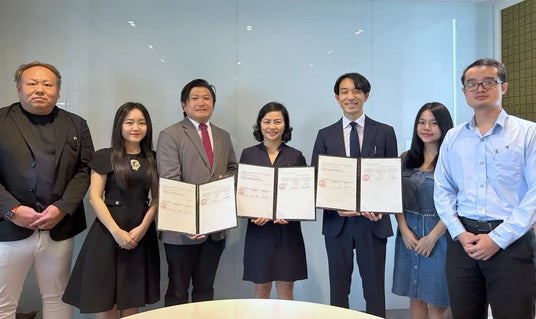 羽生モータースクールの五十幡将之取締役副社長(中央右)とTRAM ANH Groupのチャン・ティ・フェン社長(中央)、広沢自動車学校の祖川嗣朗社長(中央左)