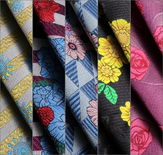 左から一花、二乃、三玖、四葉、五月の振り袖姿をイメージした西陣織