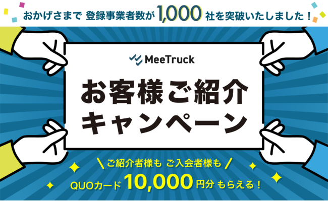 MeeTruck株式会社(ミートラック、本社:東京都港区、代表取締役社長 兼 CEO:横井 直樹、以下「MeeTruck」)は、提供中の求貨求車マッチングサービスについて、すでにご利用中のユーザーが他の事業者をご紹介いただき、紹介先が新たにMeeTruckの会員になっていただくことにより、双方に10,000円分のQUOカードを進呈するキャンペーンを、10月3日から実施いたします。
