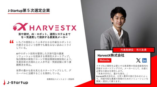 イチゴをはじめとした果菜類の自動栽培ソリューションを開発するHarvestX株式会社(本社:東京都文京区、代表取締役社長:市川友貴)は、経済産業省が運営するスタートアップ支援プログラム「J-Startup」の第5次選定企業に選出されました。