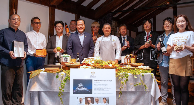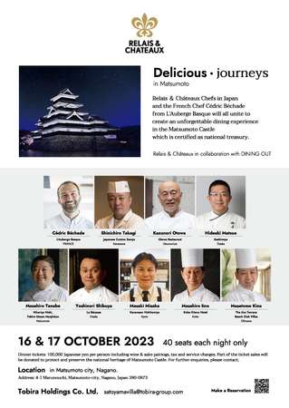 扉ホールディングス株式会社(本社:長野県松本市、代表取締役:齊藤 忠政)は、2023年10月16日(月)と17日(火)に、長野県松本市の国宝松本城 本丸庭園で、プレミアムディナーイベント「Delicious Journeys in Matsumoto」を開催します。本イベントは、観光庁の「観光再始動事業」の一環として、厳選な審査を通過したホテル・レストランが加盟する世界的な非営利組織「ルレ・エ・シャトー」と協力。インバウンド誘客による地域経済への貢献や、持続可能な観光地域づくりを目指し、信州の食文化と食材を世界に発信するとともに、収益の一部は松本市に寄付され、松本城の維持・修復費用として活用されます。10月11日(水)には、ヒカリヤニシ(長野県松本市)にて記者発表会を実施し、当社代表 齊藤 忠政、グループ統括総料理長 田邉 真宏のほか、当日使用する食材や工芸品等の地元生産者が登壇しました。