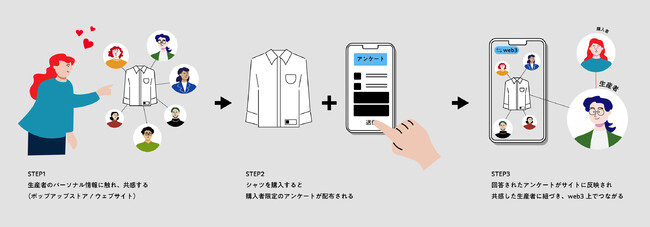 オリジナルシャツの購入者限定で回答いただくアンケート結果を元に、生産者と購入者がブロックチェーン技術を用いて弊社が提供するWEB3.0プラットフォーム「Final Chain」を通して特設ウェブサイト上でつながります。生産者の方々のパーソナル情報に触れ、購入者の方々は誰に共感したのか。是非ご覧ください。