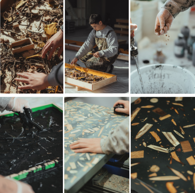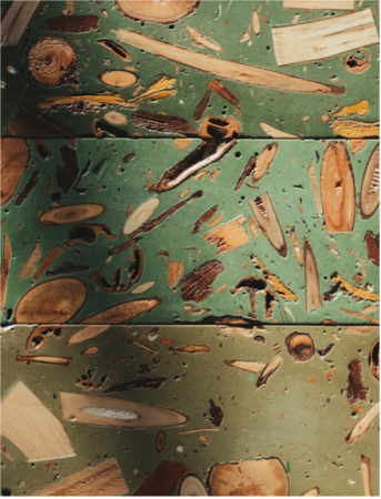 森林をめぐる課題や可能性についてリサーチを行い、製材された木材だけでなく森林そのものが持つ多様な価値に着目し、それを表現するべく様々な実験を通して新たなマテリアルとして開発されました。建築や家具に使用されることの少ない小径木や枝葉、樹皮、実、その森の土など樹木にまつわる様々な物を、反応性ミネラルベースと有機溶剤・VOCを一切使用しない完全水性アクリル樹脂と混ぜ合わせ製作されています。
