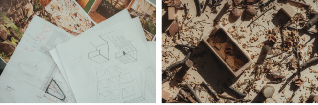 マテリアルには、狩野氏が創り出すマテリアル、ForestBank™️に「BAUMオークの森」から集めた小径木や枝葉、樹皮、実、プロダクトの木製パーツの端材などを混ぜ合わせたBAUMオリジナルのものを採用しています。