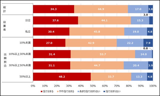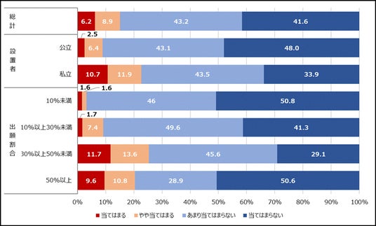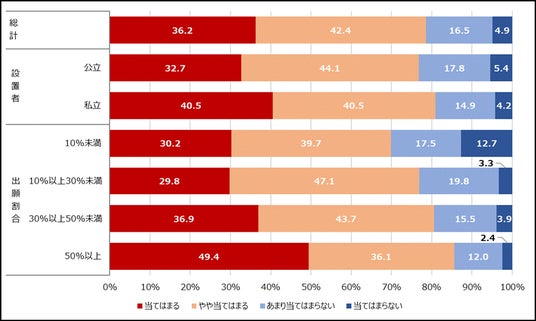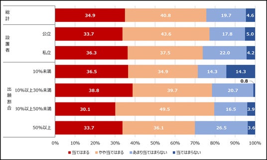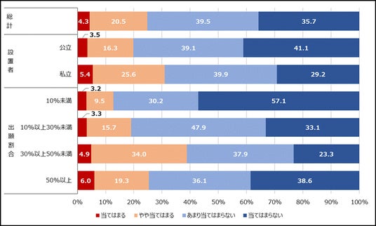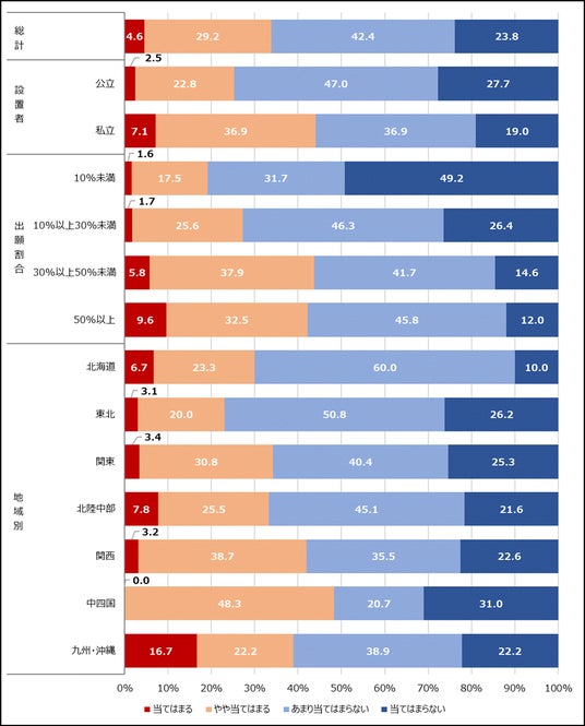 - 設置者別では公立高校において否定的な傾向が顕著に表れた。私立では「当てはまる」「やや当てはまる」の割合が4割を超え、肯定的にとらえている層が一定数いることがわかった。
