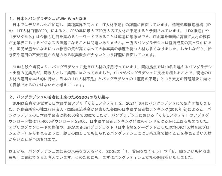 SUN株式会社(本社:東京都港区、代表取締役社長兼CEO:仲宗根俊平、以下 SUN)は、初めての海外支社をバングラデシュ人民共和国の首都ダッカに開設いたしました。