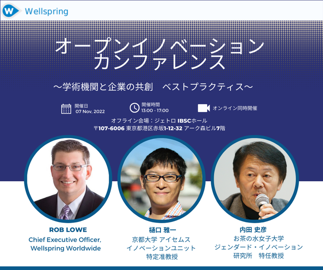 ウェルスプリングジャパン合同会社 (日本法人本社:東京都港区、日本法人代表:辻 雅史、以下ウェルスプリング)は、来る2022年11月7日に『オープンイノベーション カンファレンス ~学術機関と企業の共創 ベストプラクティス~』と題し、学術機関や企業の方々を対象としたセミナーをオンライン・オフラインで同時開催いたします。