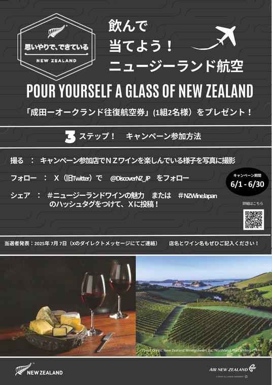 飲んで、当てよう、ニュージーランドへの空の旅!全国の参加店から対象ニュージーランドワインを飲んで、成田⇔オークランド間ペア往復券(1組2名様)が当たります。キャンペーン期間は6月1日~30日。