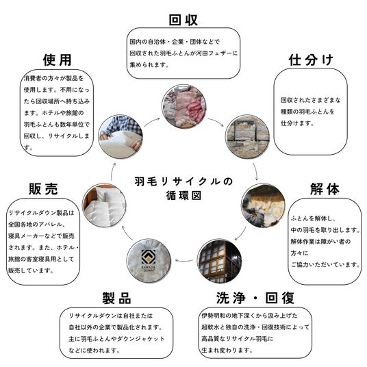 この仕組みは、不用になった羽毛ふとんを回収、独自の回復加工技術で高品質なリサイクル羽毛を精製、新たな羽毛製品として販売することで、「羽毛循環型社会」を実現するための取り組みです。