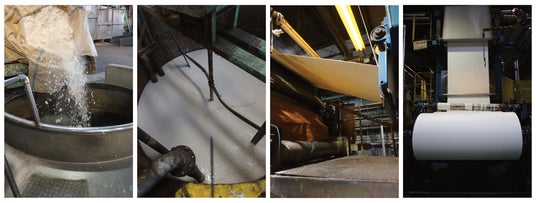 製紙の工程(古紙パルプと側生地を粉砕した原料を投入→混ぜる→形成し乾かす→巻き取る)