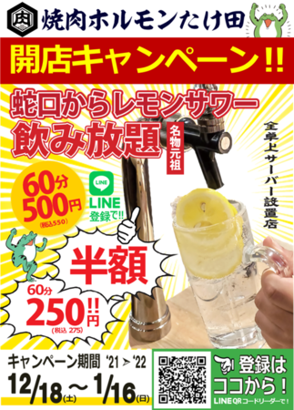 【オープンキャンペーン!】元祖名物!蛇口からレモンサワー/お1人様60分500円が半額の250円!