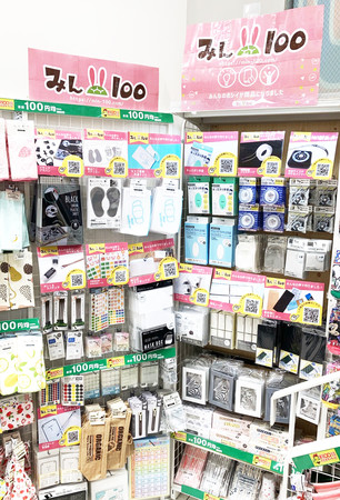 初のコラボ販売店となる「ダイコクドラッグ」内の100円ショップ「エビスマーケット」では、昨年2021年から一部店舗限定で「みん100特設コーナー」が設置されています。