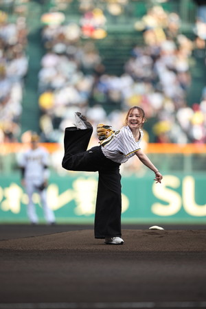 始球式にはイベントで1位に輝いたあみんちょ。が登壇。この日のために練習を重ね、背番号321のユニフォームで登場しました。投球はワンバウンドしたものの、見事捕手のミットに納まりました。