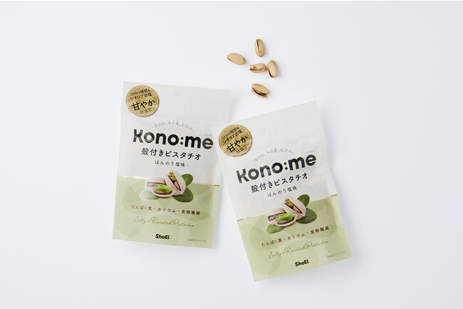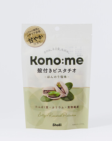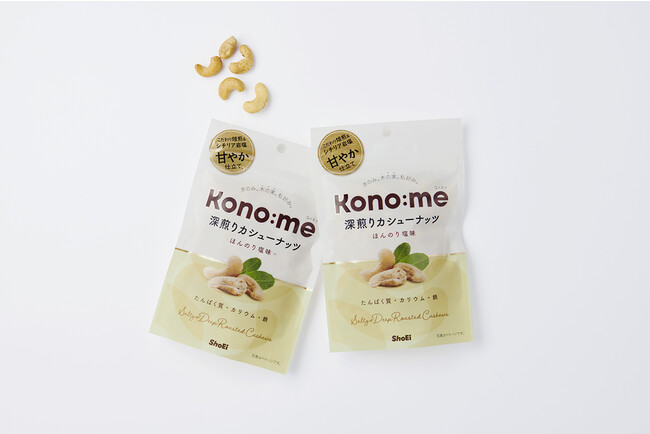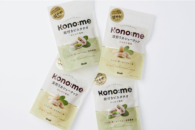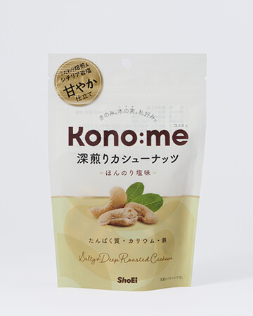 Kono:me(コノミィ)は、ナッツ・ドライフルーツ類を中心とした原料の調達・生産・加工・流通・販売を一気通貫で行うことを強みとする正栄食品工業株式会社が、専門商社でありながら製造工場を有している強みを活かし、原料・製法・味付けにこだわって製造しています。同社では、21年の新工場稼働に伴い、オリジナルの焙煎機導入を行いました。量だけでなく質もより向上した商品をより多くの方にお召し上がりいただきたいという想いから、同社での新規ルートとなる、菓子・加工食品チャネル商品となります。
