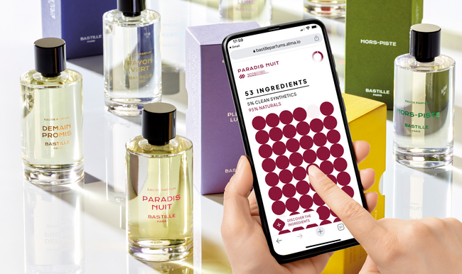 成分開示に対する消費者の要望に応えた今回の取り組みでは、Bastilleでベストセラーとなった「Pleine Lune」と新作の「Paradis Nuit」を含む2種類のフレグランスに、RFIDタグとシリアル化されたQRコードが付与されます。これにより、スマートフォンやタブレットといったスマートデバイスでQRコードをスキャンするだけで、原料の原産地、瓶詰めをした日、香りの価値や組成、サステナビリティの詳細などの情報にアクセス可能なデジタル体験を実現しました。