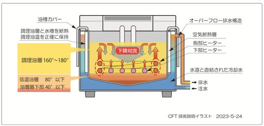 クールフライヤーは、独自の冷却構造とヒーター構成およびその制御(特許4件取得)で、油ハネや油の劣化を大幅に抑制し、以下のようなメリットを実現した業務用フライヤーです。