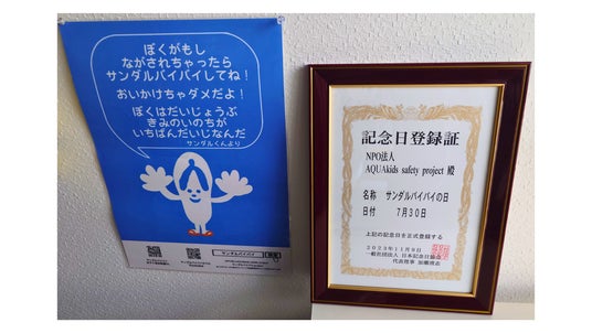 NPO法人AQUAkids safety project(所在地:大阪市中央区 代表者:すがわらえみ)は、流されたサンダルを追いかけて溺れる水難事故を予防するキーワード「サンダルバイバイ」を4年前に発案しました。更なる普及を願い、7/30を「サンダルバイバイの日」として(一社)日本記念日協会より正式に制定されました。7/30は、「7 ながされた 3サンダルは 0おいかけない」という、サンダルバイバイの意味が込められています。記念日制定されたことで、より多くの皆様に「サンダルバイバイ」を知って頂くきっかけが出来たと考えています。今後も、水難事故予防の常識として「サンダルバイバイ」を普及すべく、サンダルバイバイを伝えるWaterSafety教室の開催やライフジャケット体験会などを継続して開催していきます。