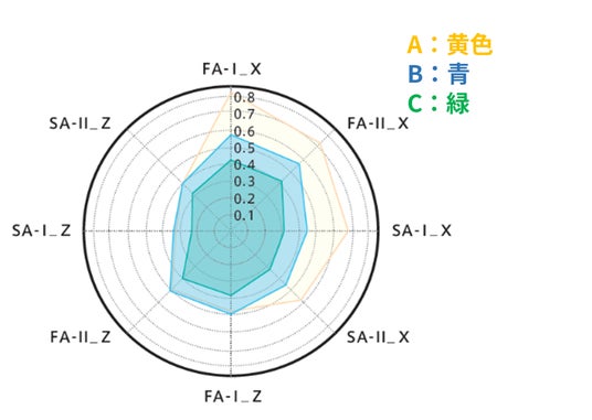 QUANTITEXTURE(TM)はこうした課題に対し、「力の測定」ではなく「人の感じ方そのもの」に着目。人がものに触れた際に反応する指の4つの機械受容器(FAI、FAII、SAI、SAII)の周波数特性を解析することで、より人の感覚に近い評価を実現します。これにより、従来は官能評価との相関を得ることが難しかった硬質素材(ガラスや樹脂、金属など)においても、触感評価を可能にしました。現在は、硬質素材だけでなく、布や不織布のような柔軟素材にも対応可能なセンサーも開発中です。