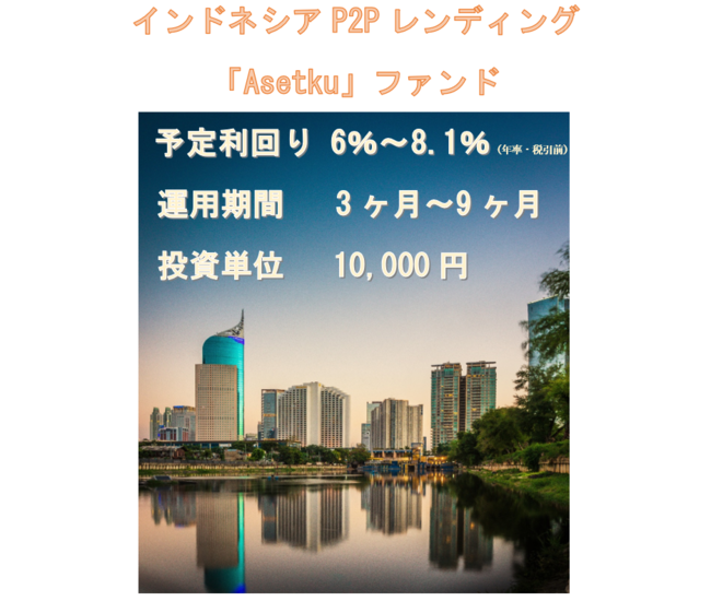 本ファンドは、インドネシア国内にて資金を借りたい個人および法人と、資金を運用したい個人および法人とをつなげるマッチングサービス(P2Pレンディング)サイト「Asetku」を利用する借り手ユーザーに対する貸付事業を資金使途とする貸付型ファンドです。