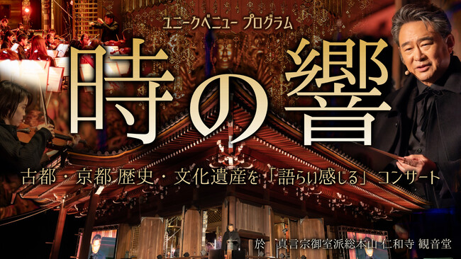 歴史的文化財「仁和寺」観音堂で開催された、「時の響」公演の配信が決定。文化財の中にフルオーケストラを配置し公演する、唯一無二「ユニークべニュー」な公演の制作過程と本公演の模様を配信するスペシャルなプログラム。岸田繁作曲の古から伝わる京の唄「京わらべうた」をモチーフに作曲された11曲からなる変奏組曲に溶ける、俳優船越栄一郎の徒然草の朗読をご堪能ください。