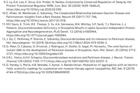 ゴーシェ病の原因遺伝子(GBA1)の変異は、パーキンソン病などの神経変性疾患との関連性が指摘されています(*10-14)。電界処置には、異常タンパク質の凝集を防ぐ効果があるとの報告もあり(*15)、もしこの作用が生体内でも再現されれば、ゴーシェ病の症状を緩和できる可能性があります。今後、ショウジョウバエモデルを用いた、ゴーシェ病やパーキンソン病に対するさらなる研究が期待されます。