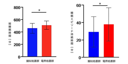 nGDモデルへの電界処置をしたところ、擬似処置群と比較して、総睡眠時間が有意に増加しました。擬似処置群の460分に対して、電界処置群は511分となりました(図2)。また、電界処置群の方が、1回あたりの睡眠エピソード持続時間が伸びたことから、睡眠の断片化が少なくなったことが示唆されました(図3)。
