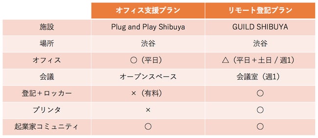 採択企業は、渋谷の「Plug and Play Shibuya powered by 東急不動産」でのオフィス支援プラン、「GUILD SHIBUYA」でのリモート登記プランのいずれかを指定し、利用することができます。