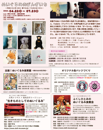 現代のぬいぐるみ作家8名の約70点の作品を展示するほか、参加作家のお1人となるFrederic(貝戸由希)が20年間で2000体以上を制作してきた、くまのぬいぐるみ「ボーちゃん」の写真パネルや資料を展示します。