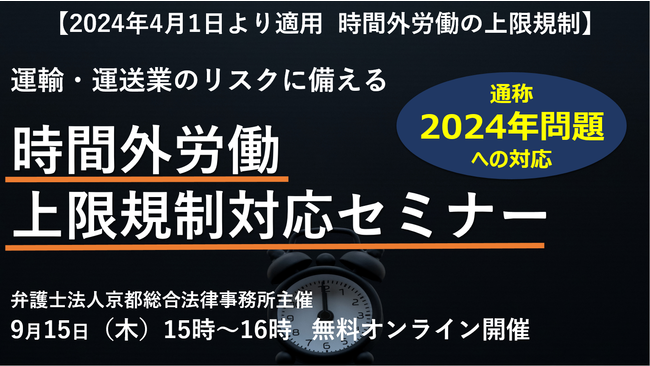 企業法務分野に精通した弁護士法人京都総合法律事務所(所在地:京都府中京区)は、「時間外労働上限規制(2024年問題)対応セミナー」をオンラインで2022年9月15日(木)に開催いたします。