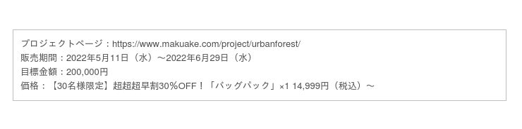 プロジェクトページ→https://www.makuake.com/project/urbanforest/