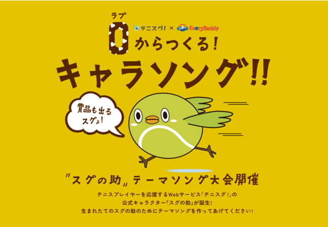 音楽プレイヤーを応援する株式会社Every Buddy (代表取締役:松本恵・大橋優也、以下Every Buddy)は、テニスプレイヤーを応援する株式会社LAWN(代表取締役:佐々木健人、以下LAWN)の協力のもと、プロ・アマチュア問わず音楽活動をしている人が誰でもオリジナル作曲作品で応募することができる<『0』から作る!キャラソング!! ~スグの助テーマソング大会>を2022年4月29日から開催しました。