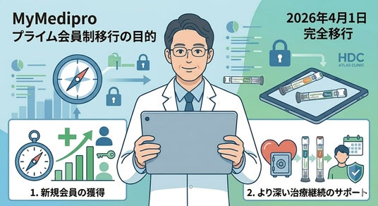 MyMedipro株式会社が提供するオンライン診療プラットフォーム「MyMedipro」の利用クリニックであるHDCアトラスクリニックは、2026年4月1日より、ゼップバウンド(持続性GIP/GLP-1受容体作動薬)のダイエット処方をMyMediproプライム会員制へ完全移行します。4月1日以降にゼップバウンドの処方をご希望の方は、MyMediproプライム会員へのご登録をお願いします。