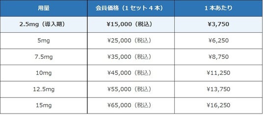 薬剤費(診察時に別途精算):導入期2.5mgは1セット(4本)15,000円(税込)から