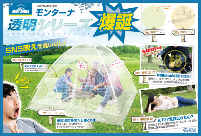 株式会社ハック(本社:大阪府東大阪市、代表取締役:有山哲也)が運営する、アウトドアブランド「Montagna(モンターナ)」は、2022年4月1日より、スケスケ仕様の『透明シリーズ 』全6アイテムを順次展開します。もはや見えない『もはや無 透明テーブル』、承認欲求を満たす『スケスケドキドキ ファミリーテント』など常に人に見られながらのドキドキ★キャンプが実現!!