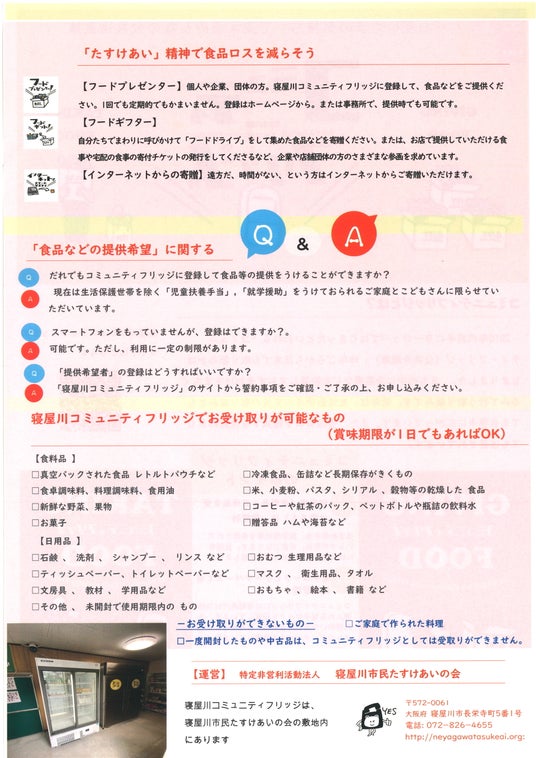 この助け合いの精神で提供をくださる個人、企業・商店などからお預かりした食料品・日用品を、NPO法人寝屋川市民たすけあいの会が設置するコミュニティフリッジ(公共冷蔵庫)内の棚や、冷蔵庫や冷凍庫にてお渡しする仕組みです。